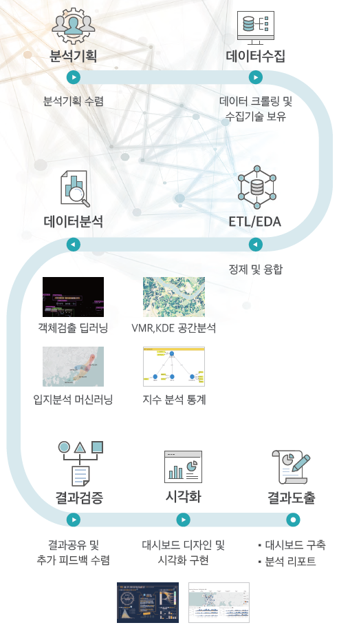 Web Portal을 비롯한 태블로 솔루션을 제공하고, 이와 관련한 태블로 사용법 관련 온·오프라인 교육을 진행합니다. 이러한 솔루션에 노하우를 더하는 서비스도 준비되어 있습니다. SPH 데이터/공간정보 분야 전문가가 제안하는 AI·BI 컨설팅, 프리미엄 서비스를 경험하실 수 있습니다.