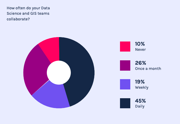 불행히도, 이들 부서 간의 협업은 보장되어있지 않습니다. 45%의 기업이 데이터 사이언스나 GIS 팀과 매일 협력하고 있다고 응답하였고, 55%는 그렇지 않다고 답했습니다.