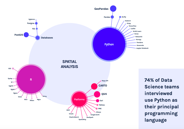 보고서에 따르면 데이터 사이언스와 GIS 부서를 보유한 기업이 점점 많아지고 있습니다. 그리고 전문 데이터 사이언티스트들 사이에서 공간적 기술이 더욱 확산될 때까지(아래에서 논의할 과제이기도 합니다), 이것은 매우 유용합니다.