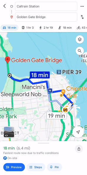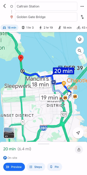 위에서 심리적 거리, 사용자의 상황, 선호도에 따라 다양한 경로가 만들어질 수 있다고 설명했습니다. 구글 지도의 경로 안내 기능은 다양한 경로 알고리즘을 통해 다채로운 경로 옵션을 제공하고 있어 나에게 가장 적합한 경로를 선택할 수 있다는 것이 장점입니다. 현재 경로 안내는 국가마다 허용되는 옵션이 다르게 설정되어 있는데요, 설명을 위해 샌프란시스코 시내 칼트레인(Caltrain)역에서 골든 게이트 브릿지로 향하는 경로를 검색해보겠습니다.