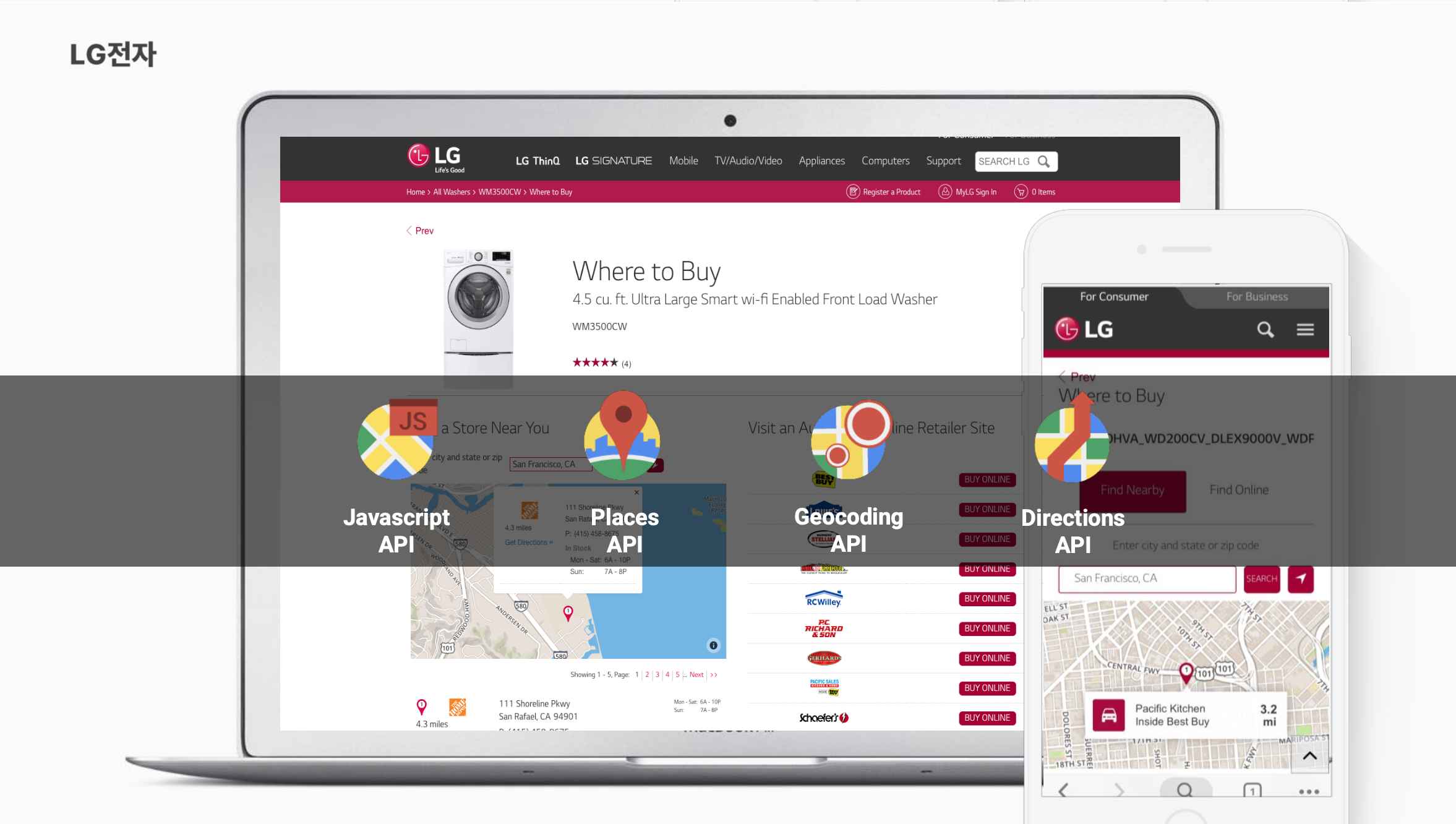 LG <Where to Buy>: 고객이 원하는 지역의 오프라인 매장 정보를 지도에 표시하는 <Where to Buy>서비스는 구글맵스플랫폼의 자동완성(Place Autocomplete API)기능을 통해 지도 상에 표시되는 매장을 클릭하면 매장의 상세주소, 연락처, 운영시간, 판매하고 있는 제품 목록 등 상세 정보를 제공합니다. 뿐만 아니라 경로검색 (Directions API)기능을 통해 사용자의 실시간 위치 자동설정 및 출발 위치설정을 제공하여 해당 매장까지의 길찾기 기능을 제공합니다.