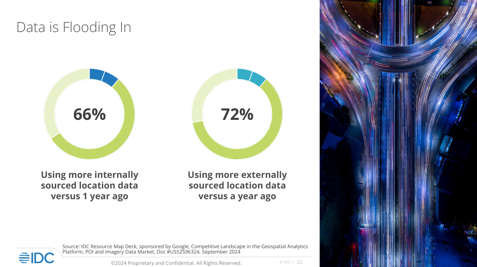 데이터 기반 경영이 중요해지는 오늘날 비즈니스의 성과를 극대화하기 위해 로케이션 인텔리전스(Location Intelligence)에 주목이 나날이 높아지고 있습니다. 글로벌 시장 조사 기관 IDC(International Data Corporation)가 2024년 8개국의 비즈니스 C레벨 이상 1,300명을 대상으로 조사한 결과, 응답자의 51%가 공간정보에 대한 투자로 KPI가 크게 향상되었으며, 91%는 5% 이상의 비즈니스 개선 효과를 경험했다고 답했습니다. 또한 66%는 내부적으로 수집한 공간정보 데이터를 적극적으로 활용중에 있으며, 72%는 외부 플랫폼에서 공간정보 데이터를 구매해 활용하고 있다 밝혔습니다.