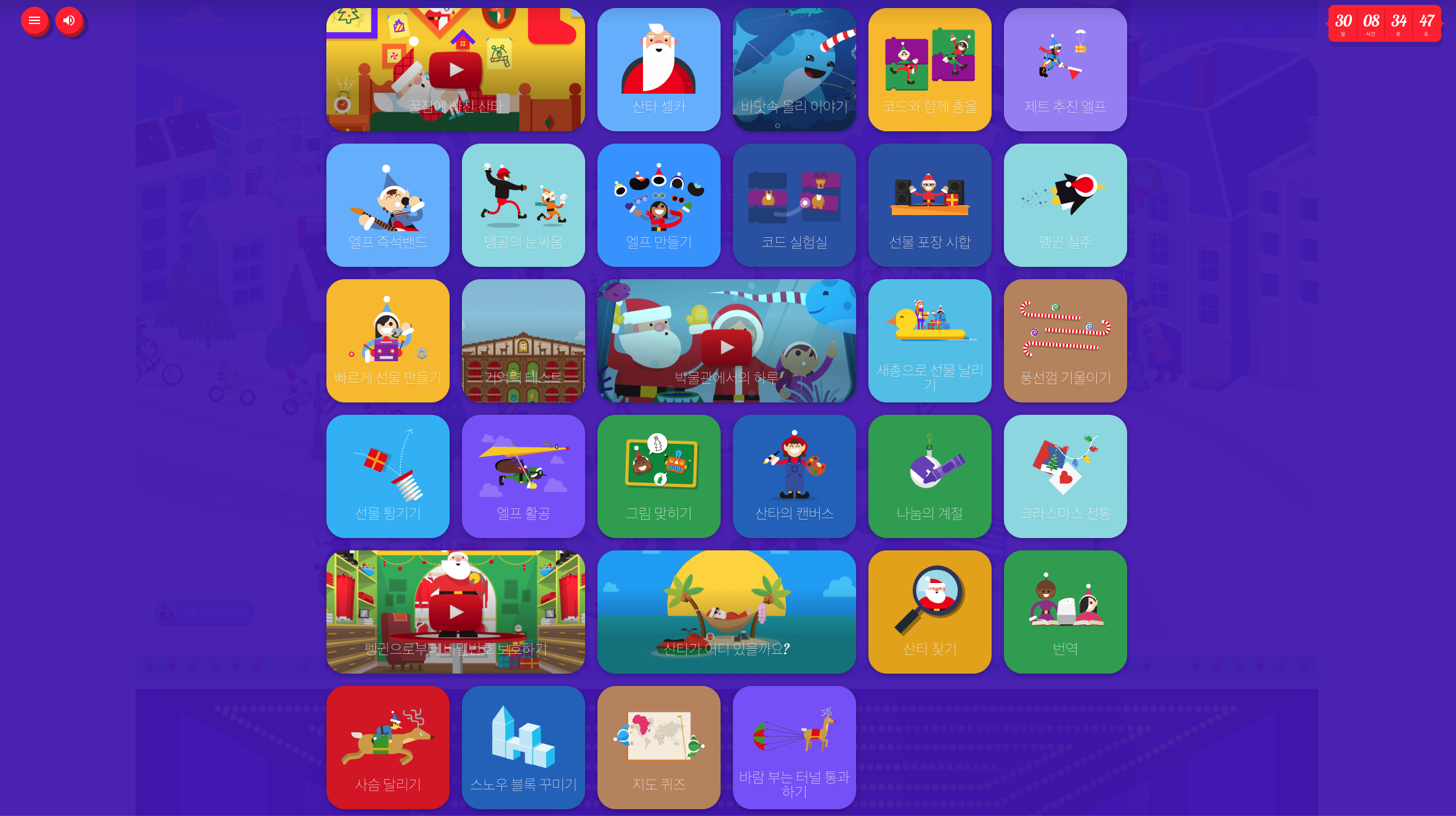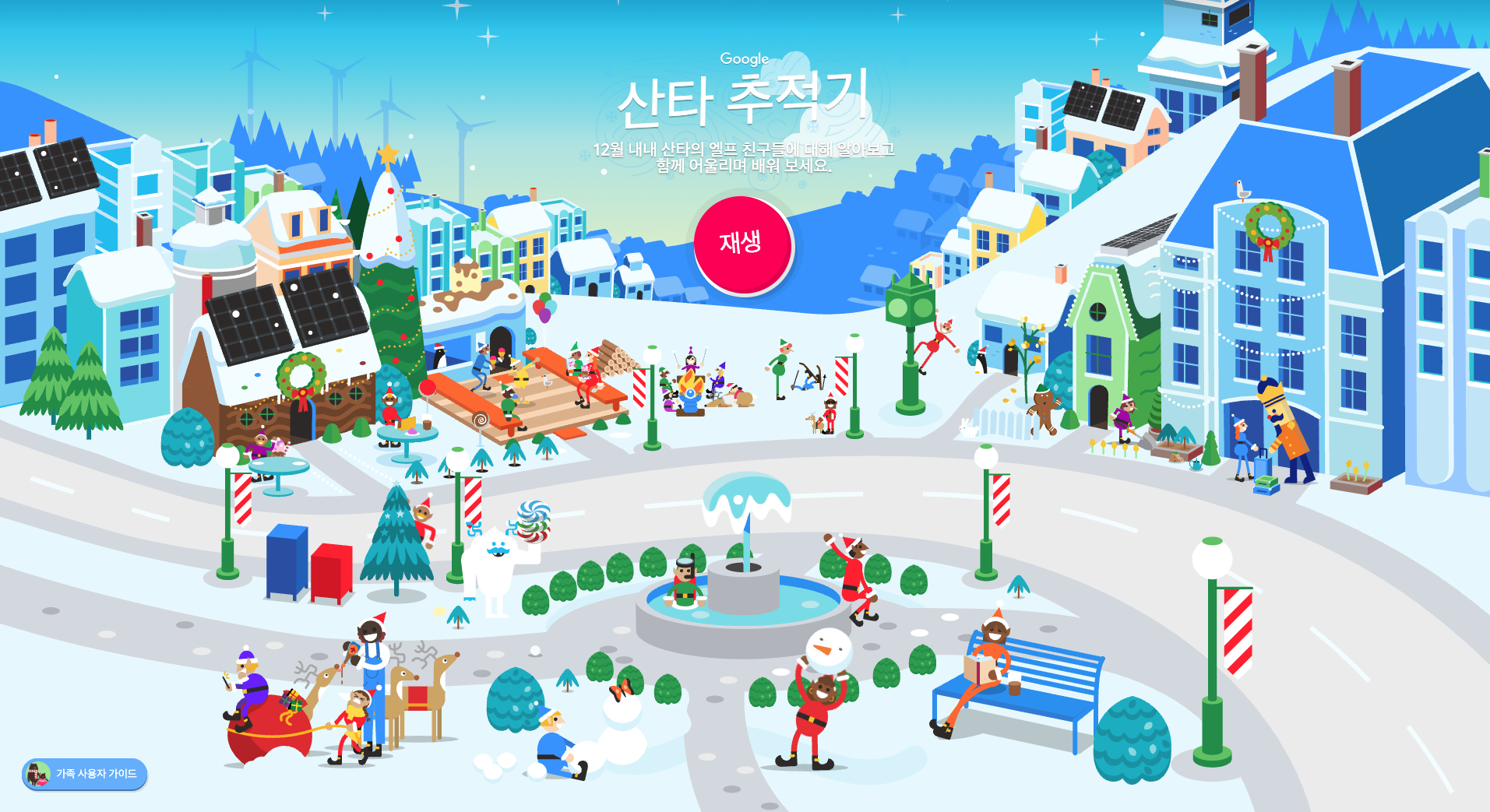 산타가 크리스마스이브에 출발하기 전까지 구글 산타 트래커는 온 가족이 함께 즐길 수 있는 ‘산타 마을’을 공개합니다. 산타 마을은 가족이 연말을 즐길 수 있는 크리스마스 테마 놀이공원 같은 느낌입니다. 좋아하는 모든 캐릭터를 찾을 수 있고, 모든 연령에 맞는 재미있고 교육적인 대화형 활동이 제공됩니다.