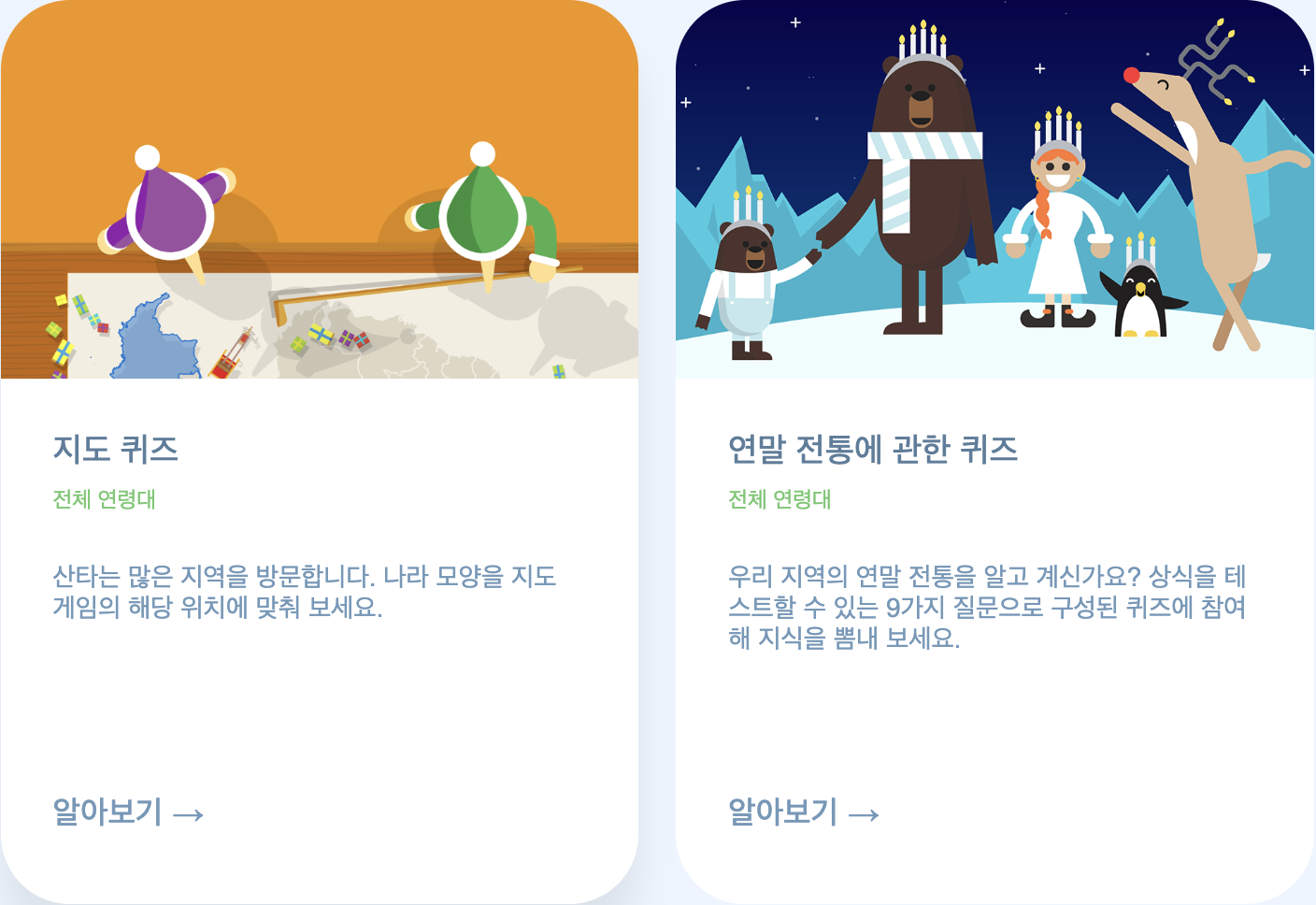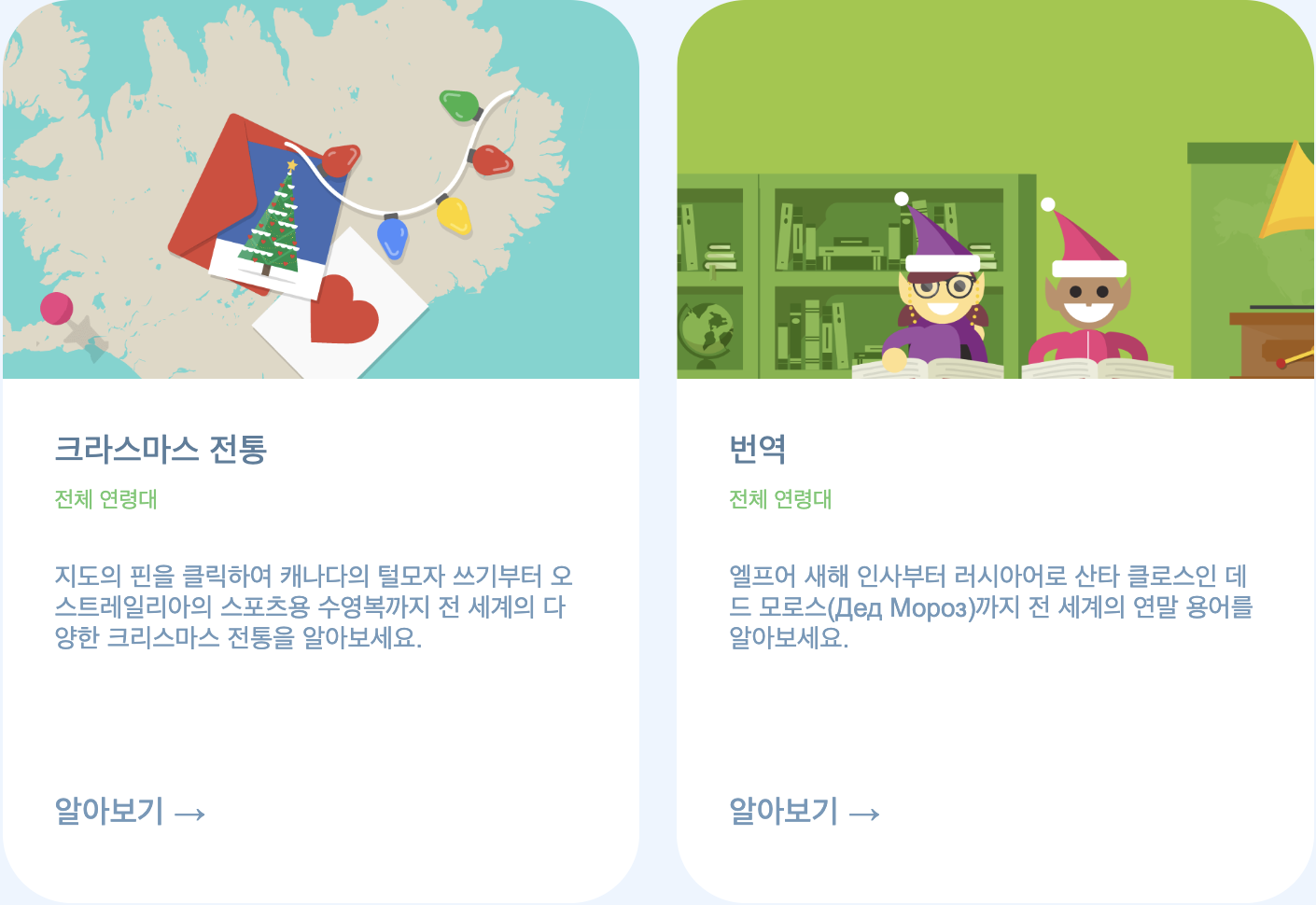 전 세계에서 연말을 지내는 모습을 다양한 게임과 퀴즈로 알 수 있습니다. 크리스마스 전통을 알아보는 게임에서는 구글 지도 위에 펼쳐진 핀을 클릭하여 다양한 국가의 크리스마스 전통을 알아볼 수 있습니다. 번역 게임, 연말 전통에 관한 퀴즈 등을 통해 세계의 연말 용어를 알아보고 연말 전통에 대한 이해도 높일 수 있습니다.