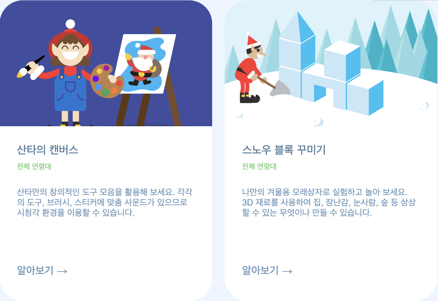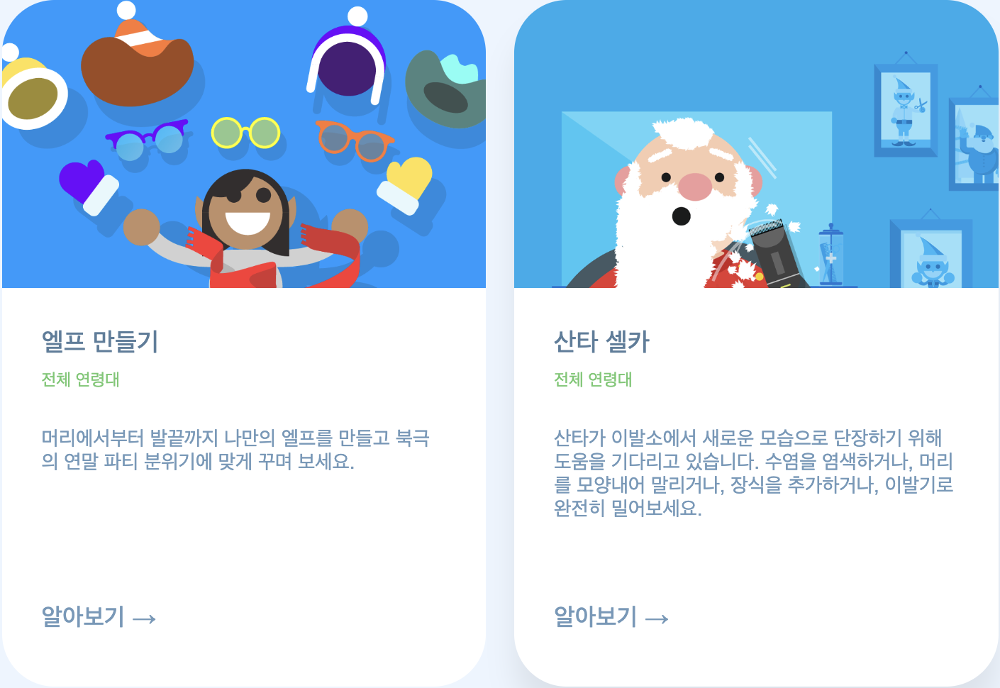 산타의 캔버스에서 그림을 그려보고, 나만의 엘프를 만들어서 북극 연말 파티 분위기에 맞게 꾸며 볼 수 있습니다. 산타의 셀카를 위해 직접 이발을 해주는 게임도 있네요!