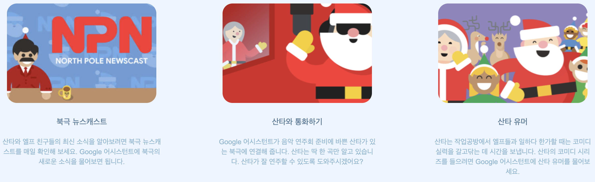 구글 어시스턴트를 이용하면 산타와 엘프 친구들의 최신 소식도 알 수 있고, 산타와 통화하며 산타의 연주도 들을 수 있답니다. 산타는 딱 한 곡만 알고 있다고 해요. 과연 무슨 곡일까요?🎵