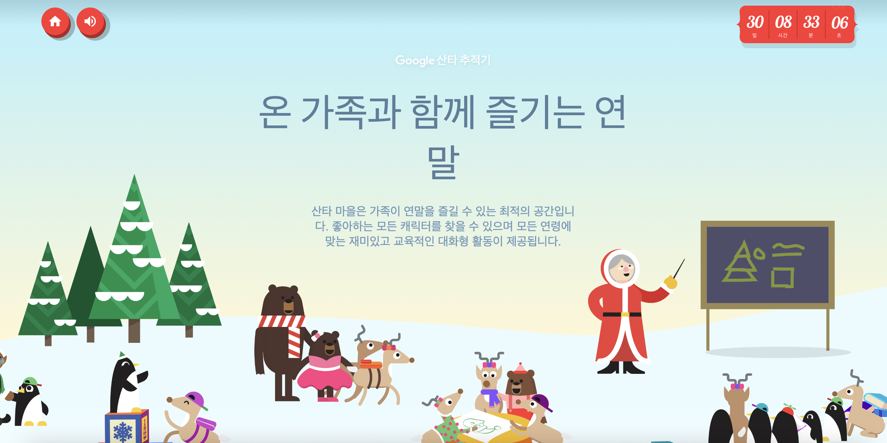 12월 24일이 되면 산타 마을이 산타를 추적하는 환경으로 변합니다. 산타와 순록들이 전 세계 어린이들에게 선물을 배달할 때, 산타를 추적할 수 있습니다.