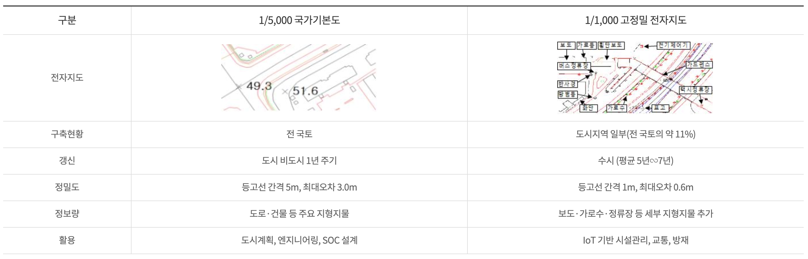 1/5,000 국가 기본도와 1/1,000 고정밀 전자지도의 차이를 설명한 표