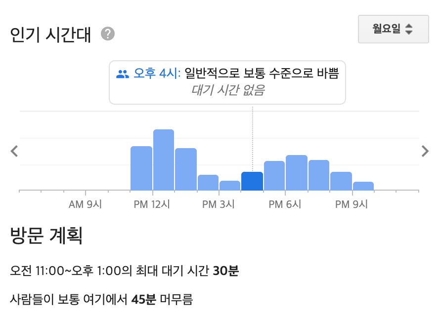 구글은 아래 사진과 같이 업체의 인기 시간대, 체류 시간, 예상 대기 시간 등 방문 데이터를 제공해왔습니다. 이번 업데이트는 이러한 기능을 교통수단에까지 확장한 것입니다.