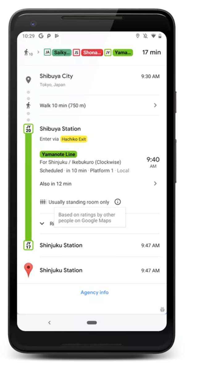 또한 혼잡도 예측 기능은 과거의 데이터를 기반으로 버스, 기차 또는 지하철이 얼마나 혼잡한지 알 수 있습니다. 구글은 이 데이터를 수집하기 위해 지난 10월부터 이용객들을 대상으로 교통수단의 혼잡도에 대해 조사했으며, 계속해서 실시할 예정입니다. 이제 미리 좌석이 있는지를 보고, 바로 열차를 탈지 다음 차량을 기다릴지를 결정할 수 있게 되었습니다.