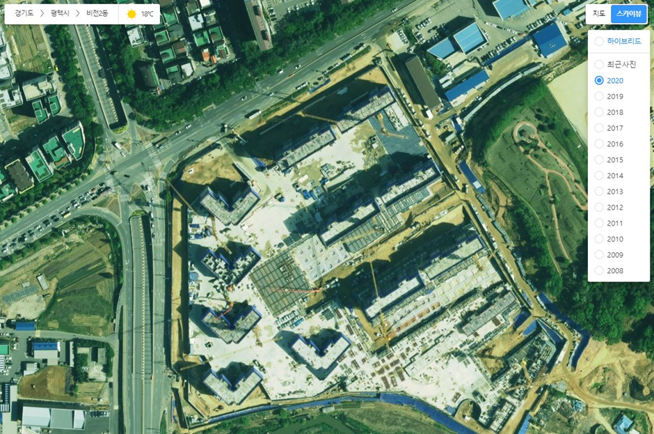 참고로 네이버지도와 카카오지도의 위성영상은 모두 동일하게 국토지리정보원에서 제공 받고 있었습니다. 그럼 네이버지도와 카카오지도에서 살펴본 평택 뉴비전 엘크루 항공 영상을 살펴볼까요?