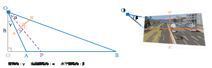 iDesktopX의 영상 포지셔닝 구현 기술에 대해 더 자세히 알아볼까요? 아래 그림에서 보이는 포인트 O는 카메라 포인트, AB는 지상 범위, A’B’는 해당 사진, C는 사진의 중간 지점입니다. 영상 속 지리 좌표(x,y,h), 방위각, 피치각 γ, 수직 시야각 α, 수평 시야각 β을 토대로 삼각 함수 관계에 따라 사진 속 C의 지리 좌표 A’와 실제 거리 B’를 구할 수 있습니다. 사진의 픽셀 크기와 실제 거리 사이의 관계에 따라 실제 거리를 구한 후 아래 그림에서 보이는 임의의 점 P’의 지리적 좌표 역시 구할 수 있습니다.