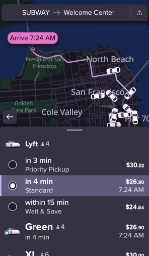 구글맵에서 택시 및 공유 차량 탭을 누르면 공유 차량 플랫폼인 Lyft로 자동 연결됩니다. 이 경우 원하는 차의 종류, 크기, 친환경 옵션, 고급 차량, 지역에 따라 e바이크, 지역 이동 수단까지 다양한 옵션과 그에 따른 요금, 최대 승차 인원수, 예상 소요 시간, 기다림 시간 등의 추가 정보도 함께 제공됩니다.