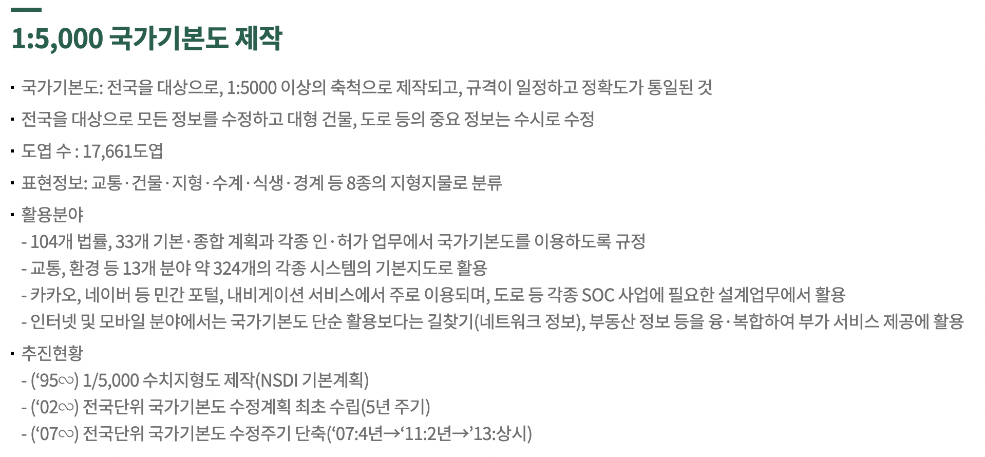 1:5,000 국가기본도 제작에 관한 설명. 활용분야에 대한 설명으로 "카카오, 네이버 등 민간 포털, 내비게이션 서비스에서 주로 이용되며, 도로 등 각종 SOC 사업에 필요한 설계업무에서 활용. 인터넷 및 모바일 분야에서는 국가기본도 단순 활용보다는 길찾기(네트워크 정보), 부동산 정보 등을 융복합하여 부가 서비스 제공에 활용.